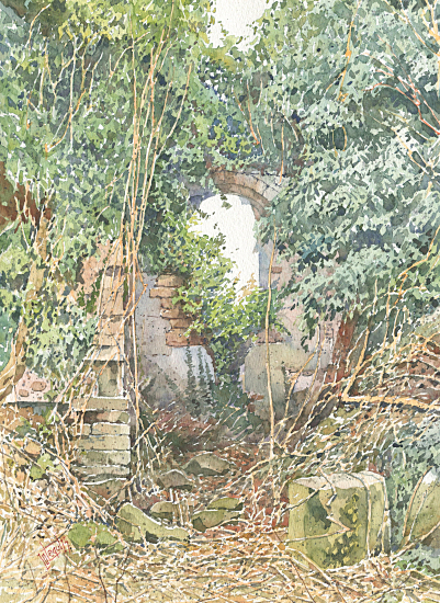 Przejście w murze - pałac w Barcinku, akwarela 2025